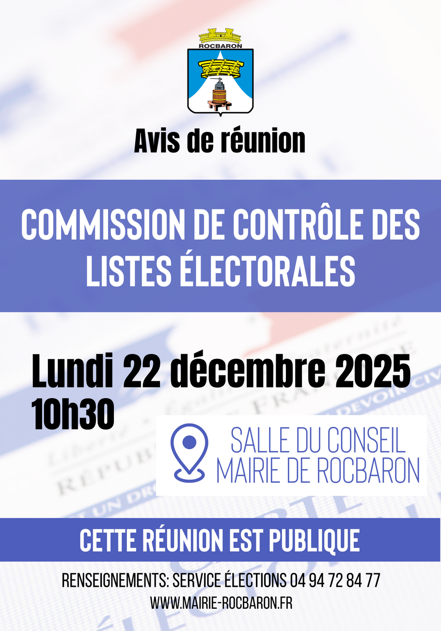 Conformément à l’article L.19 du code électoral, la commission de contrôle chargée d’examiner la régularité des listes électorales et de statuer sur les éventuels recours administratifs préalables obligatoires se réunira lundi 22 décembre à 10h30 en salle du Conseil de la Mairie de Rocbaron. La séance est publique.